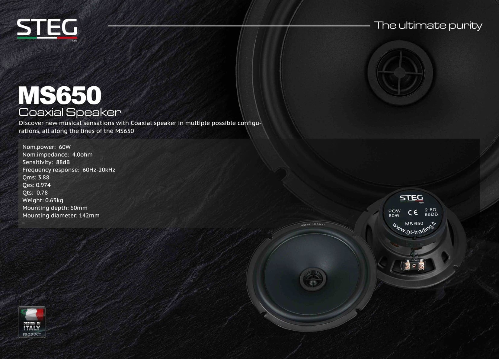 STEGのMS650コアキシャルスピーカーは、ツイーターを内蔵した特殊コーティングを施したペーパーコーンを採用し、ハイクオリティなサウンドを実現しています。