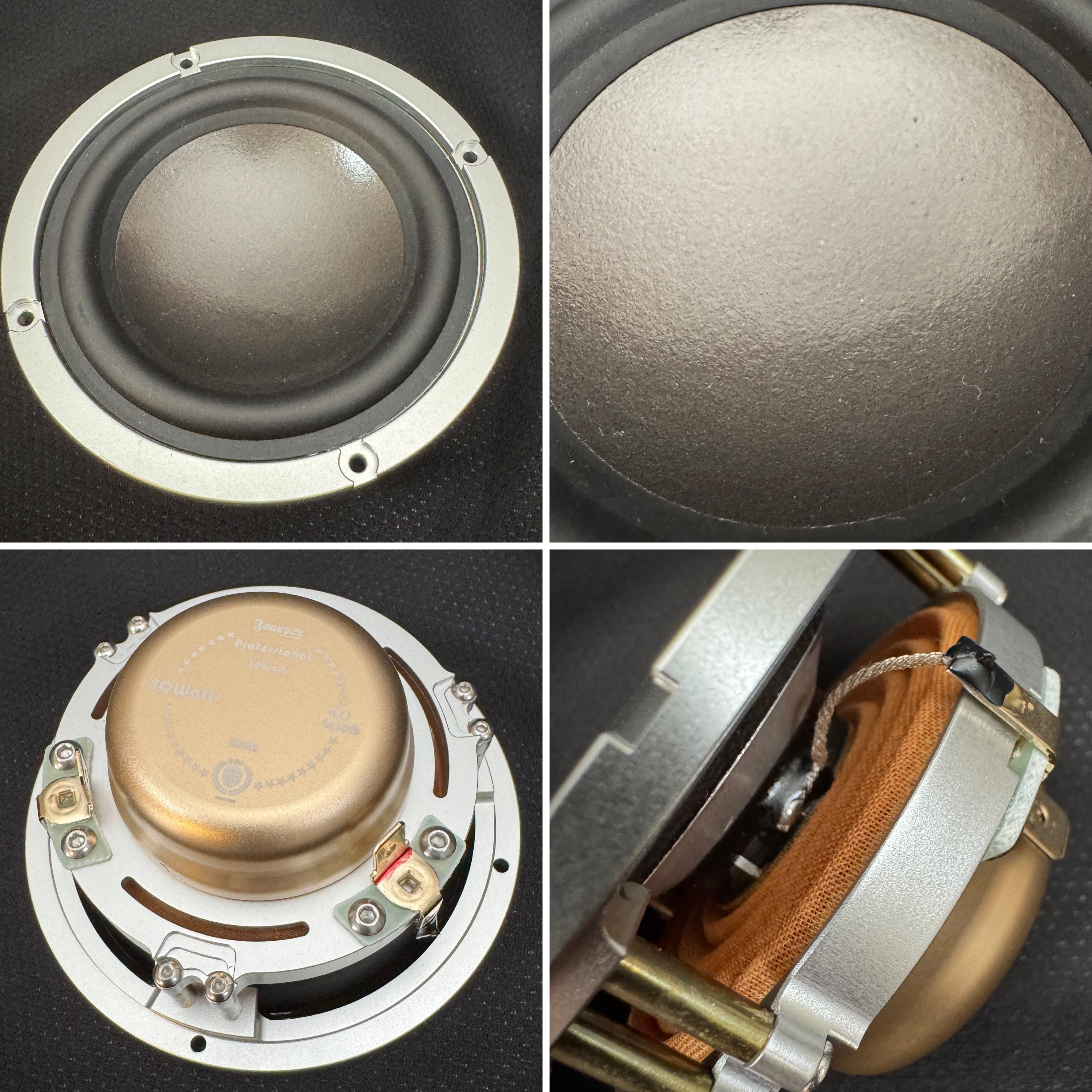 振動板は複雑な複合コーンを採用し、表面はセラミック層でコーティングされており、高減衰な鍋底形状のルーズプレス製法を採用しています。