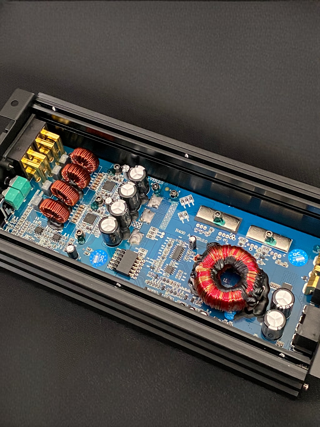 小型で低損失で非常に高い電力効率なので、車載環境のバッテリーによる駆動を考慮した場合最適な設計になっています。そして本商品は近年の進歩によって非常に高音質化を実現しています。