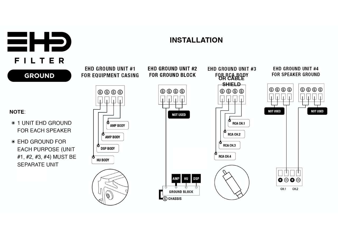 取り付け箇所はアンプのヒートシンク、ヘッドユニットやアンプやDSPのケース金属部分、電源アースブロック、RCAシールドやスピーカーマイナス端子への接続が推奨ですが、例えば2本を2台のアンプケース金属部に接続して、残りの2本はRCAへ接続する等の本製品1台に対しての組み合わせは不可ですので、アンプのケースに接続した場合は、アンプのケースへ統一して接続する必要があります。