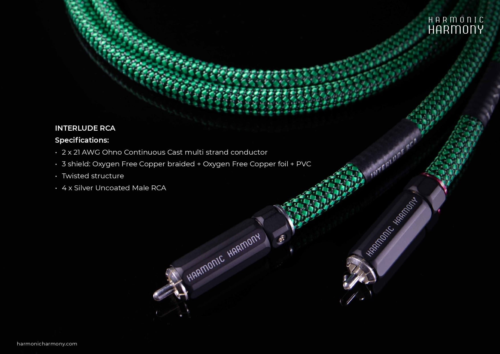 Harmonic HarmonyのInterlude(インタールード)RCAケーブは、静かな背景に対して、全周波数範囲にわたって高レベルなディテールとサウンドバランスを提供します。